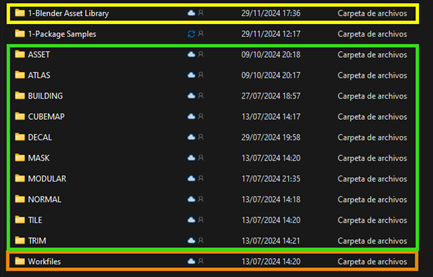 - Assets: Folder named as the Monday card + Exported Modellib (GLTFs + Textures).