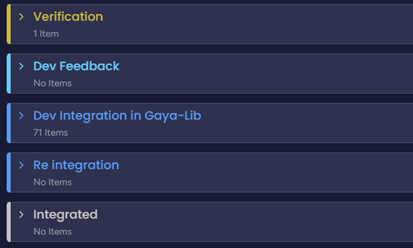Madrid marks an item “For integration” and moves it to Dev Integration in Gaya Lib.