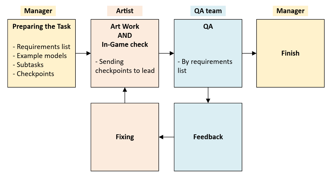 - Artist Check In-Game - In this step, the artist should check the model in-game and correct any problems. When they believe the model is ready, the artist will pass it for QA.
