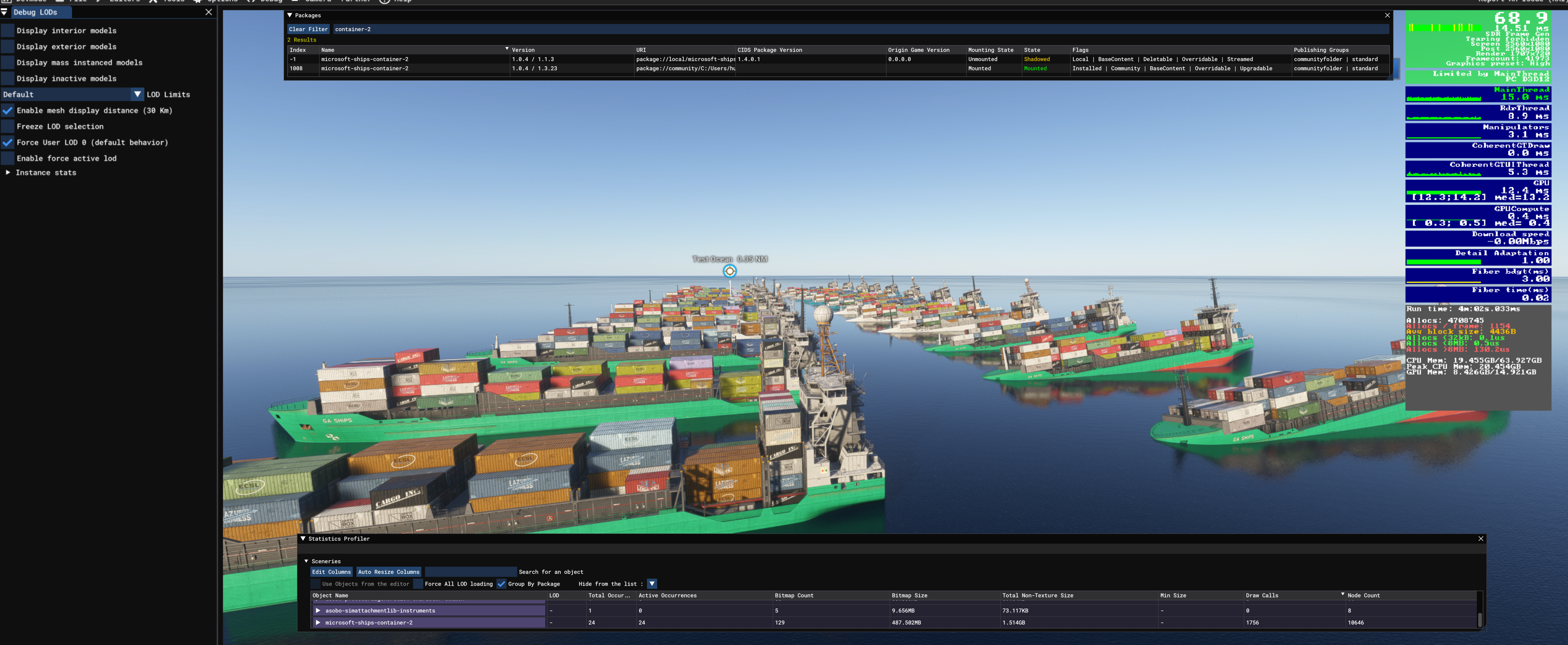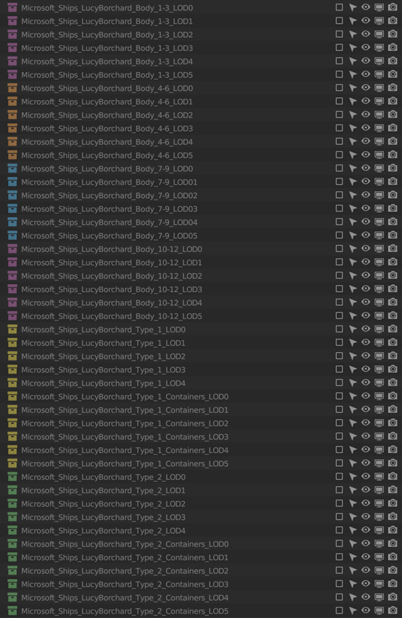 - Independent LODs: The main ship model is divided into smaller, independent sub-models. This allows for granular control over LOD transitions, ensuring that only necessary details are rendered at any given distance.