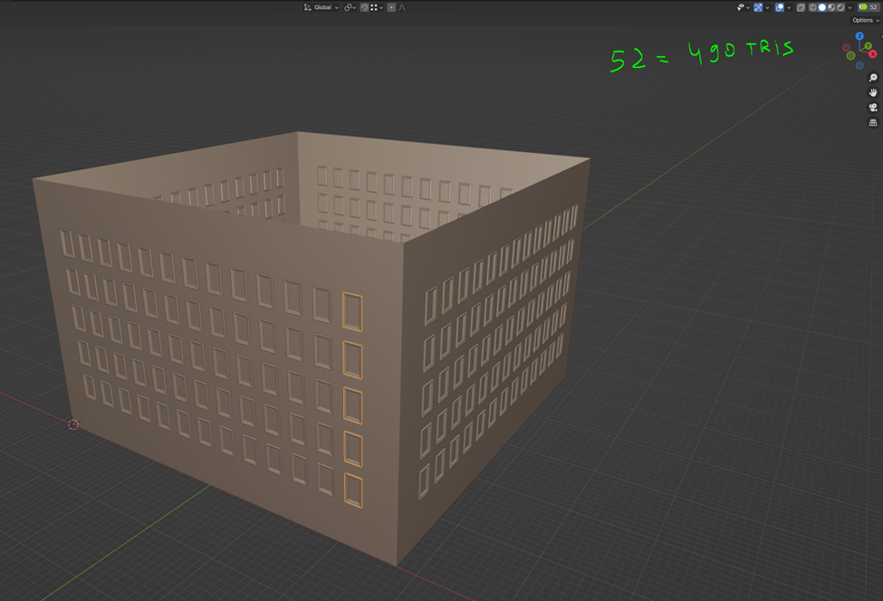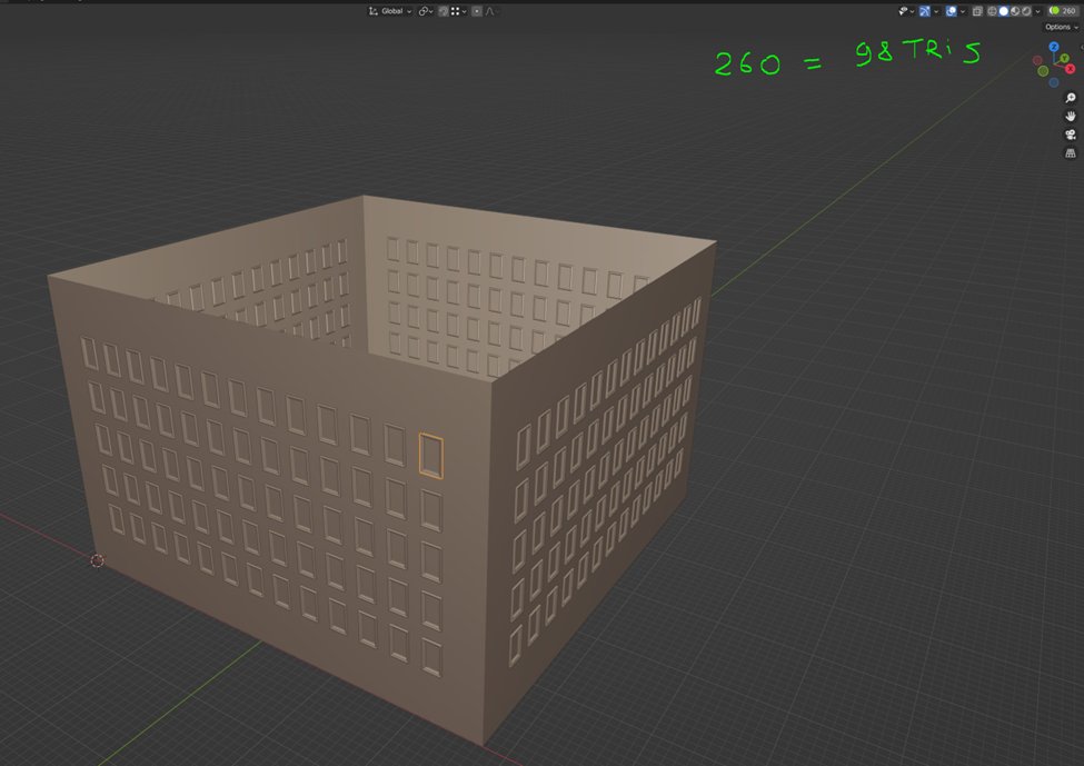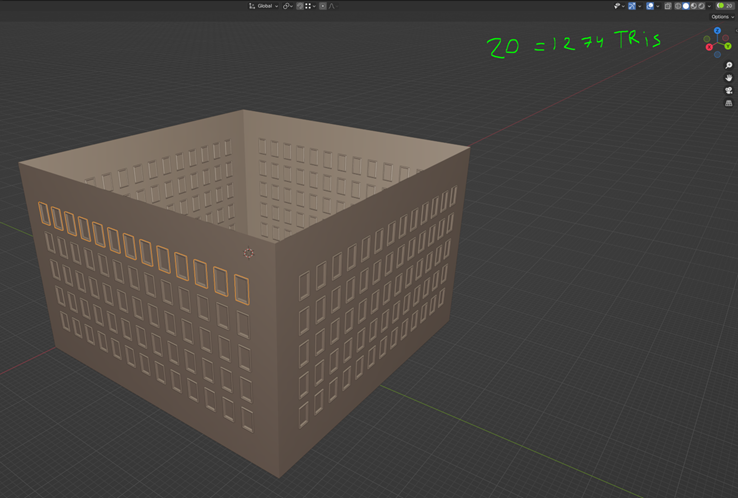 As you can see we don’t increase polycount too much, usually a building of this size with all details costs ~25k tris and about 400 objects, and we can reduce the number of windows from 260 to 52 and we will add only 392 tris, in percent this difference will make more sense, we decreasing number of objects 2 times (from 400 to 192) but polycount increases only up to 1.6%